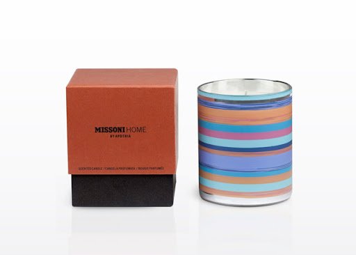 A Missoni leva sua vibrante assinatura têxtil para o universo das fragrâncias com velas e home sprays em embalagens multicoloridas, que são um deleite visual e sensorial.